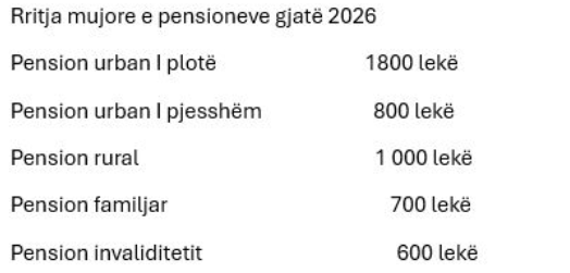Nga ky fillim viti hyn në fuqi dhe vendimi i qeverisë për rritjen e pensioneve nëpërmjet bonuseve mujore ashtu sic njoftoi më herët edhe kryeministri Edi Rama. Rritja do të jetë e përmuajshme sipas kategorive të ndryshme të pensionistëve. Përfituesit në qytet do të marrin shtese rreth 1.800 lekë në muaj, 800 lekë/muaj për pensionet urbane të pjesshme, 1000 lekë në muaj për pensionet rurale, 700 lekë në muaj për pensionet familjare dhe 600 lekë për pensionet e invaliditetit.Kjo skemë e re e panjohur më parë, synon të përmbushë angazhimin e qeverisë për të çuar pensionin minimal në vend 20 mijë lekë dhe pensionin mesatar në qytet 40 mijë lekë.Por cfarë do të përfitojnë konkretisht një pensionist i cili sot merr 27 mijë lekë në muaj?