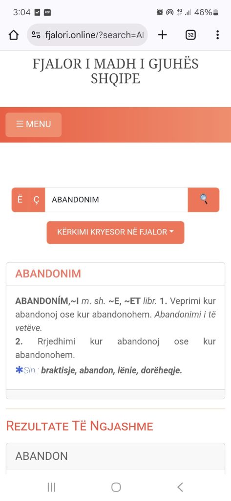Aktualisht, tani që po shkruaj, disa prej tyre janë terezitur, fjala bie fjala ABANDONOJ (fotoja sa mëposhtë), është fshirë, por prej saj ka mbetur si fjalë shqipe fjala ABANDON (?), që nuk e di se nga cila shqipe e kanë huazuar, se nga kjo e jona nuk më duket. Apo BYTHADRITË, e cila edhe sot gjendet në fjalor, por për të cilën nuk na janë dhënë përdorime të mundshme. Nwse klikon tek vendi ku duhet të të shfaqen këto përdorime, nuk të del asgjë shembull, shiko thotë mos ke shkruar fjalëm gabim.