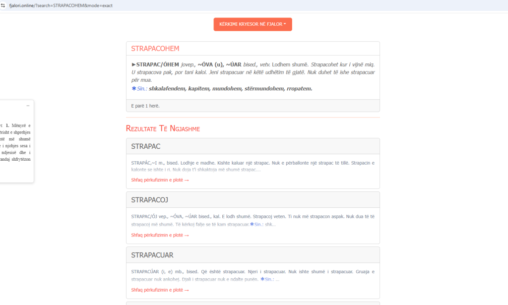 Sa më sipër i kam debatuar gjatë në fejsbuk, e janë ndryshuar pjesërisht, ndaj sa më poshtë, po vazhdoj edhe me një fjalë që është përdorur gjerësisht në vitet ’95, por që aktualisht nuk mund të thuhet se vazhdon të gjallojë, e ca më keq të jetë ngulitur aq shumë në shqipe sa të bëhet pjesë e fjalorit. Kjo është fjala STRAPACOJ. Po, e lexuat mirë, e kini në Fjalorin e Madh Shqip me shpjegimet përkatëse, konsultuar sot më 19.01. 2026.
