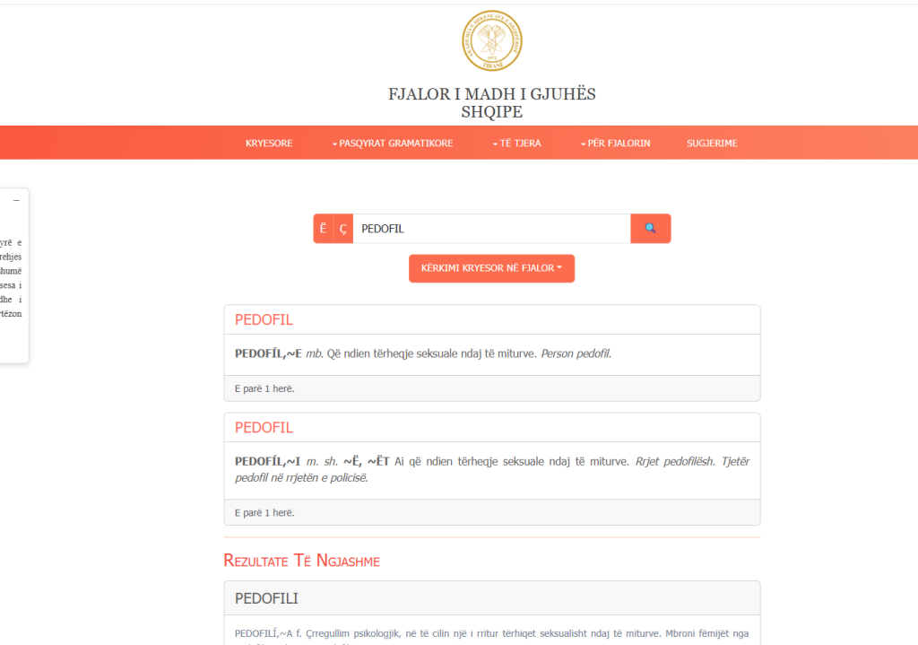 Marrim një tjetër fjalë problematike, konsultuar po sot më 19.01. 2026. PEDOFIL. Shpjegimi për këtë fjalë është “që ndjen tërheqje seksuale ndaj të miturëve”, në një kohë kur duhej të përfshinte togfjalëshin “perversitet seksual”, për t’i dhënë shpjegimin e duhur e për ta bërë sa më të qartë për përdoruesit e rinj të fjalorit.